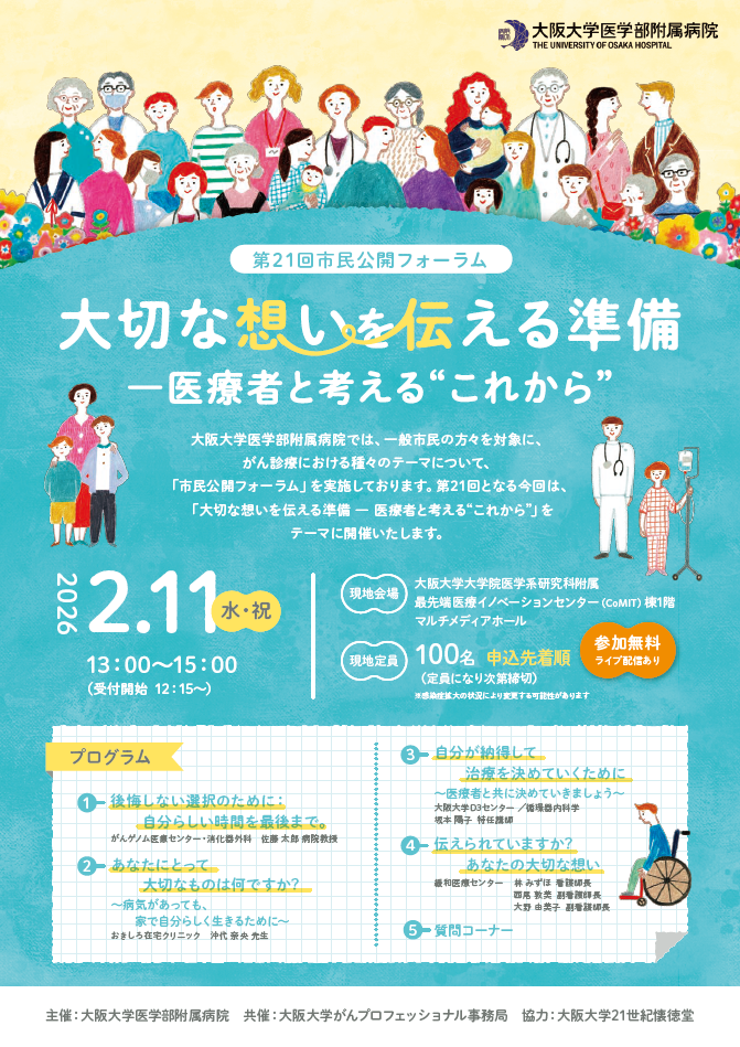 大阪大学医学部附属病院では一般市民の方々を対象に、がん診療における種々のテーマについて、「市民公開フォーラム」を実施しております。第21回目となる今回は、「大切な想いを伝える準備 ― 医療者と考える“これから”」をテーマに対面及びライブ配信にて開催いたします。多数のご参加をお待ちしております。